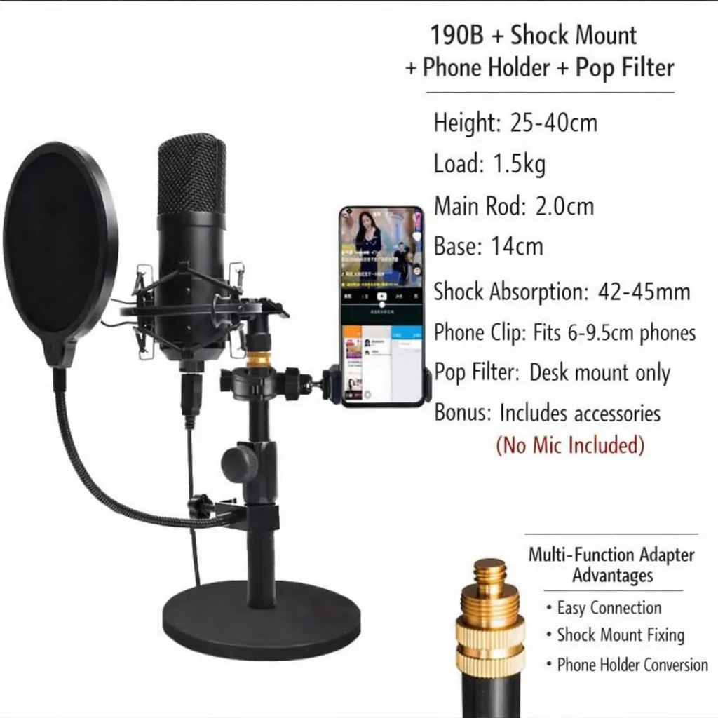 Upgrade your recording setup with this adjustable desktop microphone stand kit featuring a shock mount, pop filter, and 360° phone holder. Perfect for podcasting, streaming, gaming, and online teaching.
