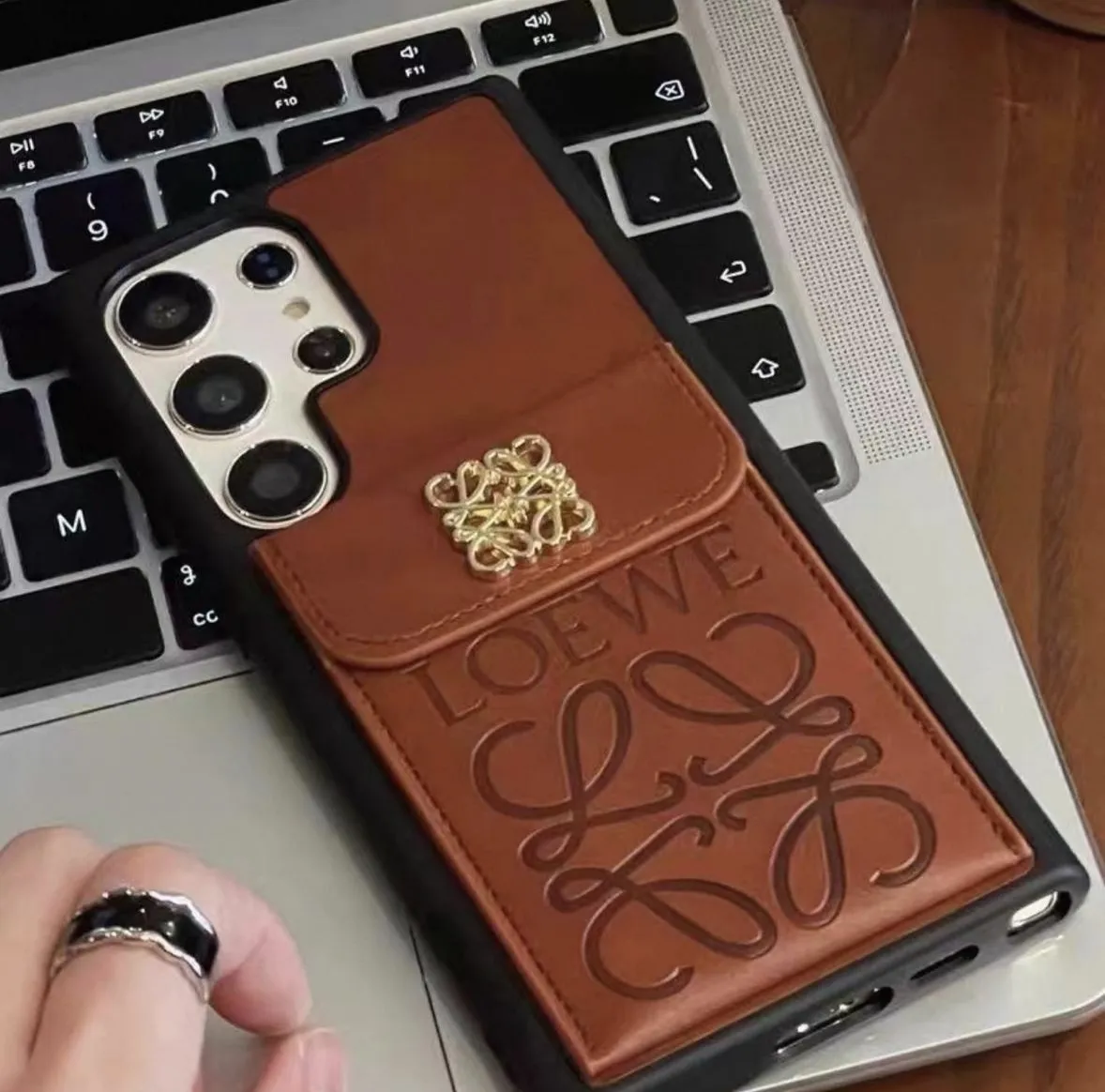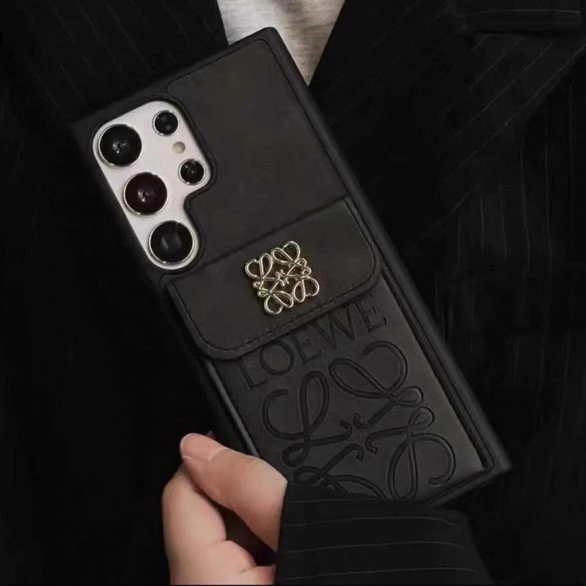 Upgrade your smartphone protection with this luxury leather card holder phone case, designed for users who value both style and functionality. The case features a premium leather back with an embossed designer pattern and a secure flap pocket with a metallic logo clasp, allowing you to carry essential cards or small cash conveniently.
