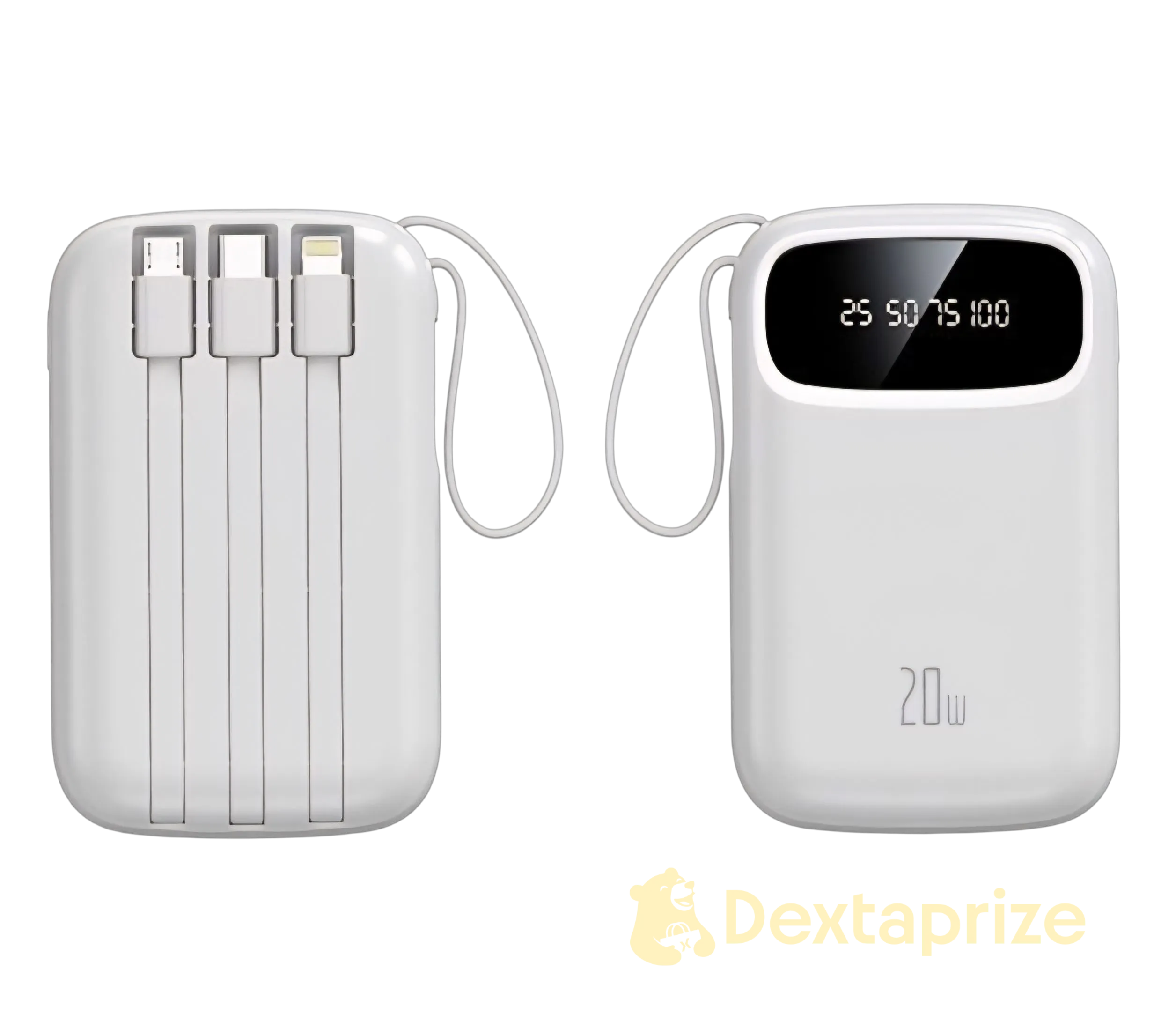Portable 20W power bank with 4 built-in cables, fast charging, and LED battery display. Perfect for iPhone, Android & tablets.