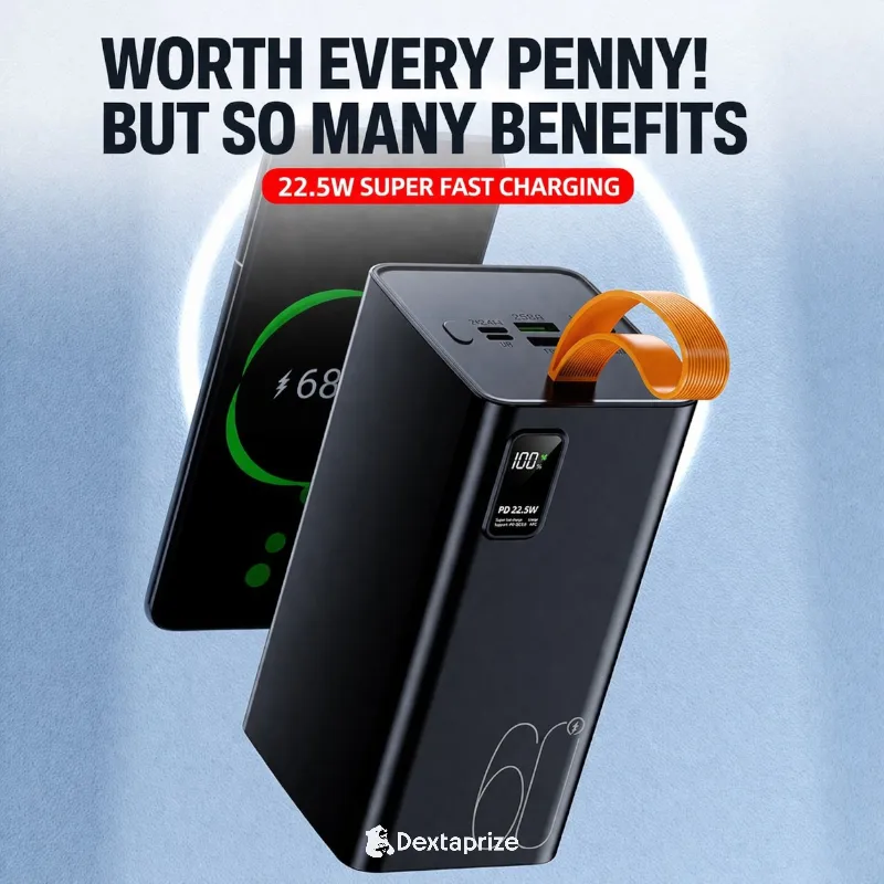 Get reliable power with the 60000mAh power bank featuring 22.5W super fast charging, LED display, and multi-device support. Perfect for travel and heavy use.