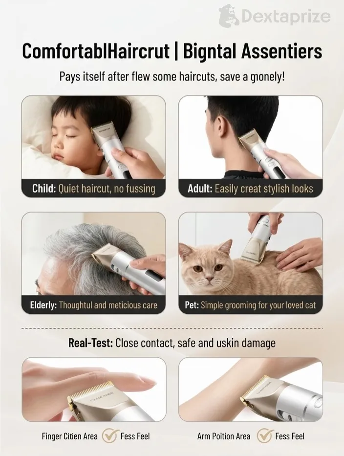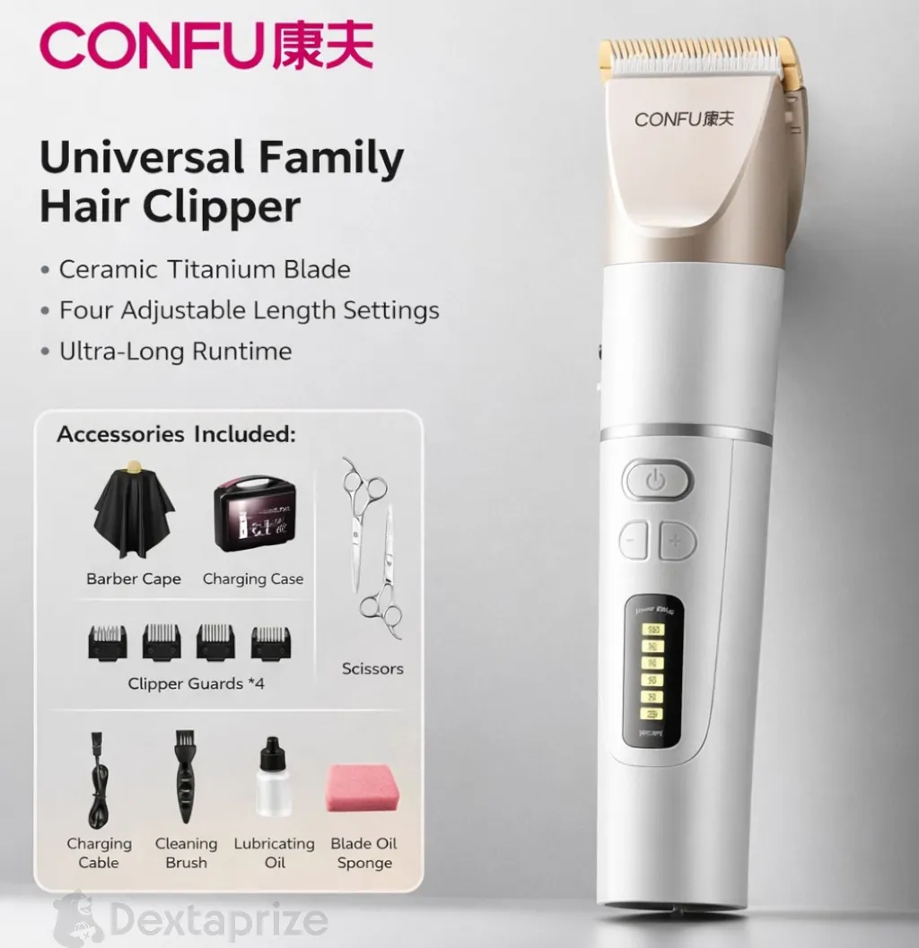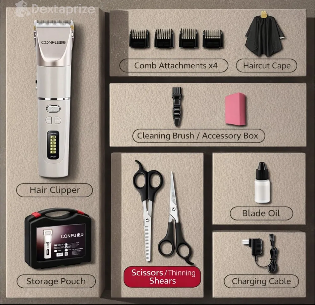 Upgrade your grooming routine with the CONFU Cordless Hair Clipper, designed for precision, comfort, and versatility. Perfect for the whole family, this all-in-one grooming kit delivers smooth, snag-free cutting with its advanced ceramic-titanium alloy blade.
