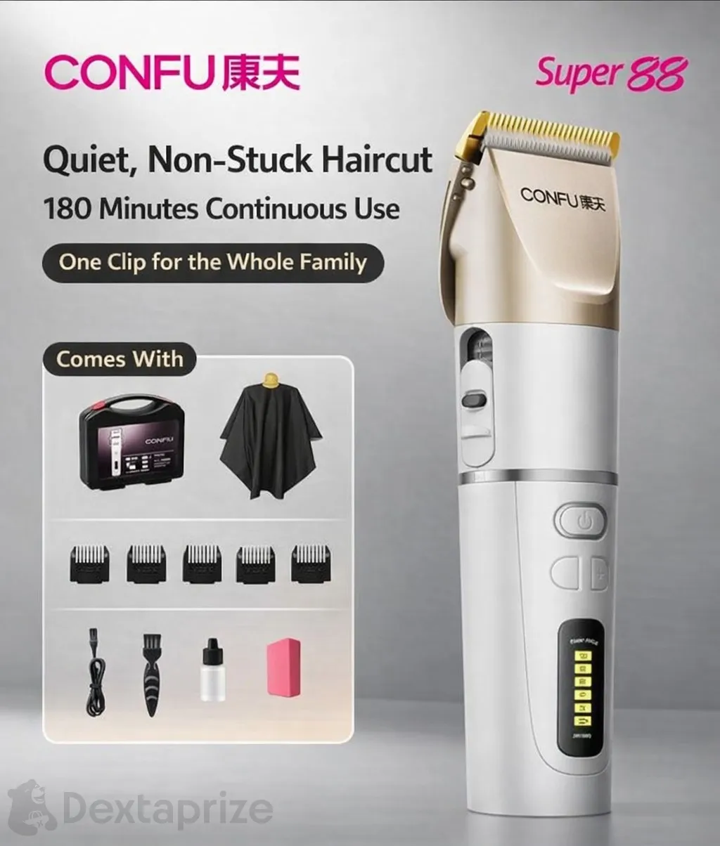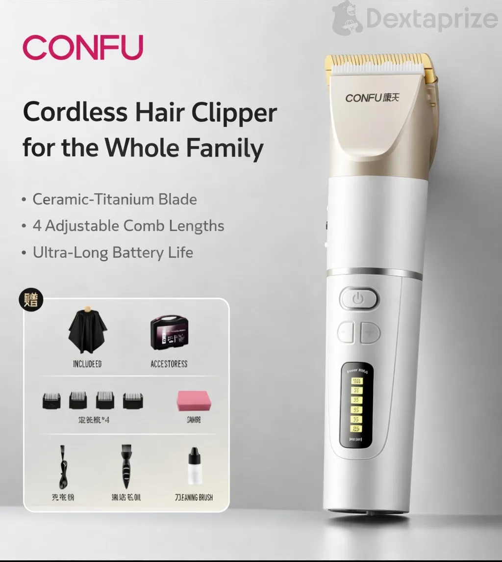 Shop the CONFU cordless hair clipper with ceramic titanium blade, adjustable length combs, and long battery life. Perfect all-in-one professional grooming kit for home and family use.