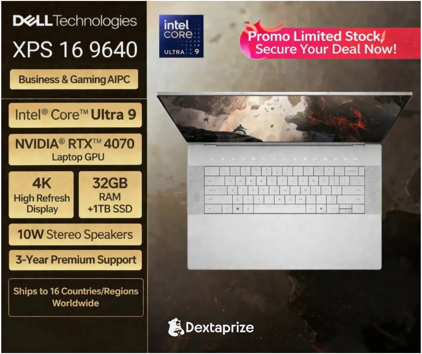 Buy the Dell XPS 16 9640 with Intel Core Ultra 9, RTX 4070, 32GB RAM, and 4K display. Perfect for business, gaming, and creative workflows.