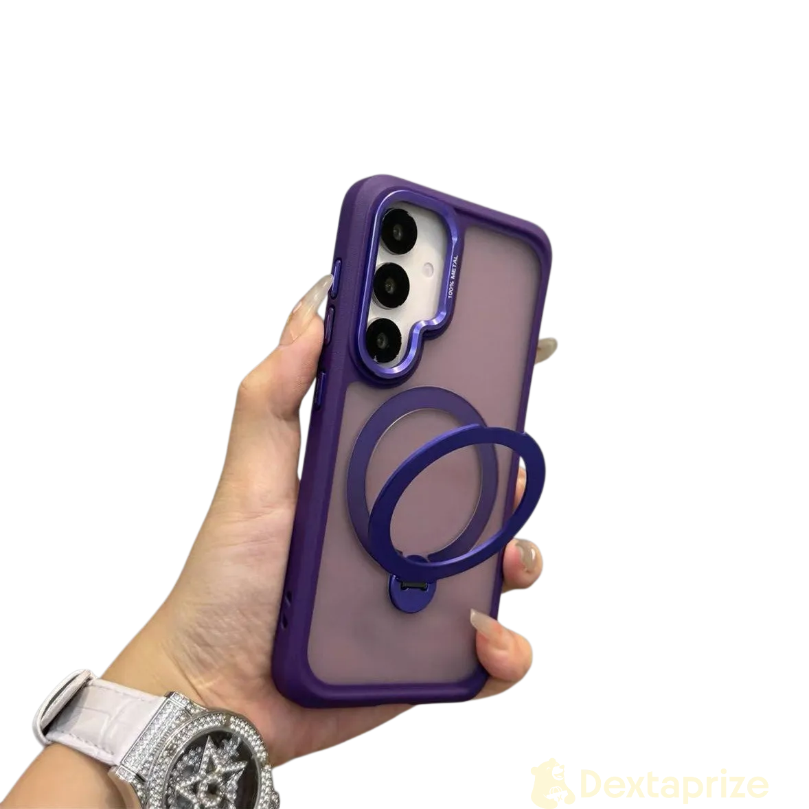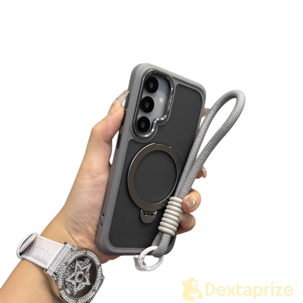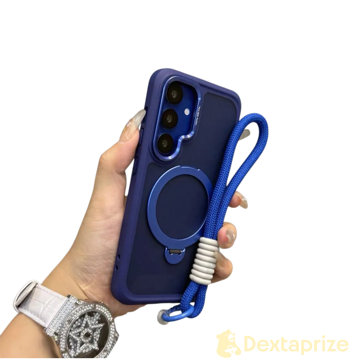 Protect your Samsung Galaxy with this magnetic ring holder phone case featuring a shockproof design, rotating kickstand, transparent back, and secure wrist strap for everyday convenience.