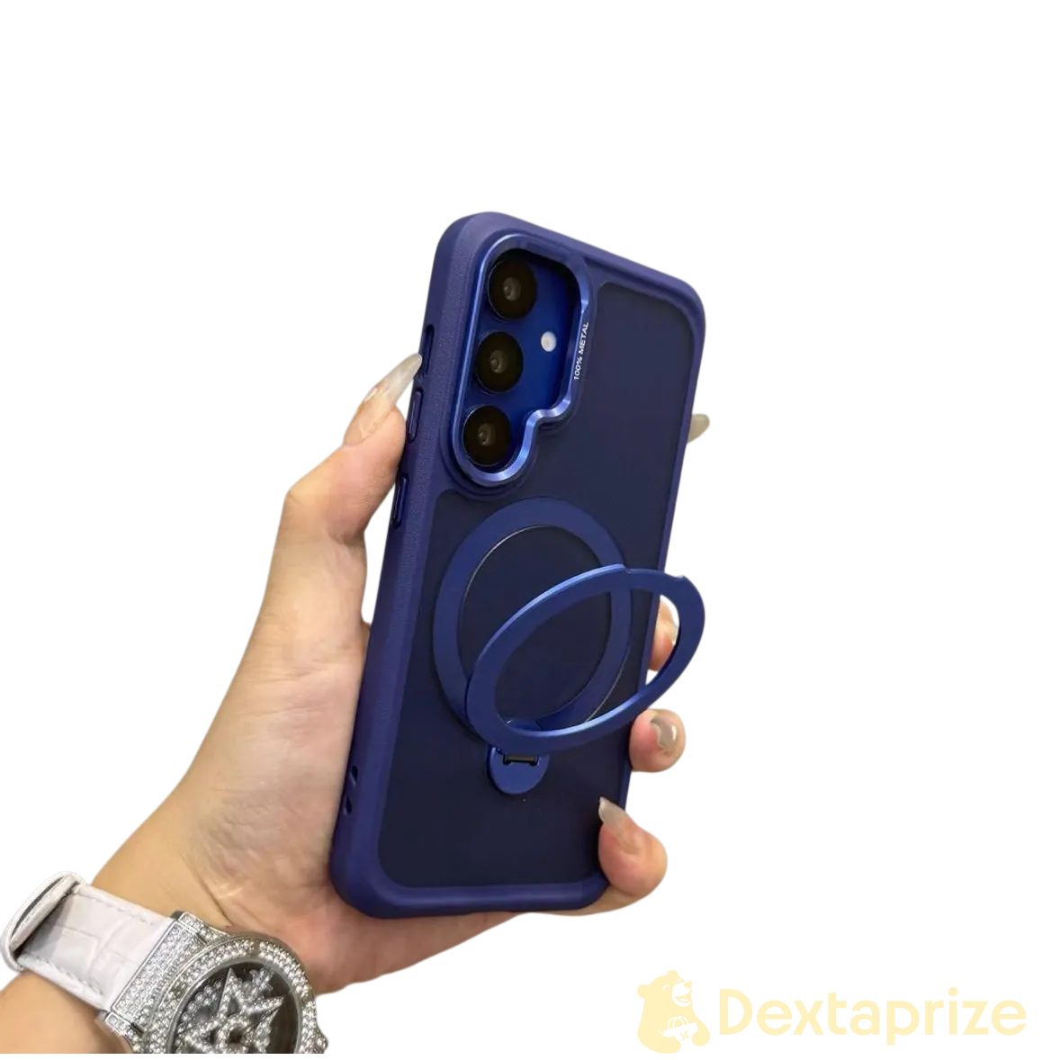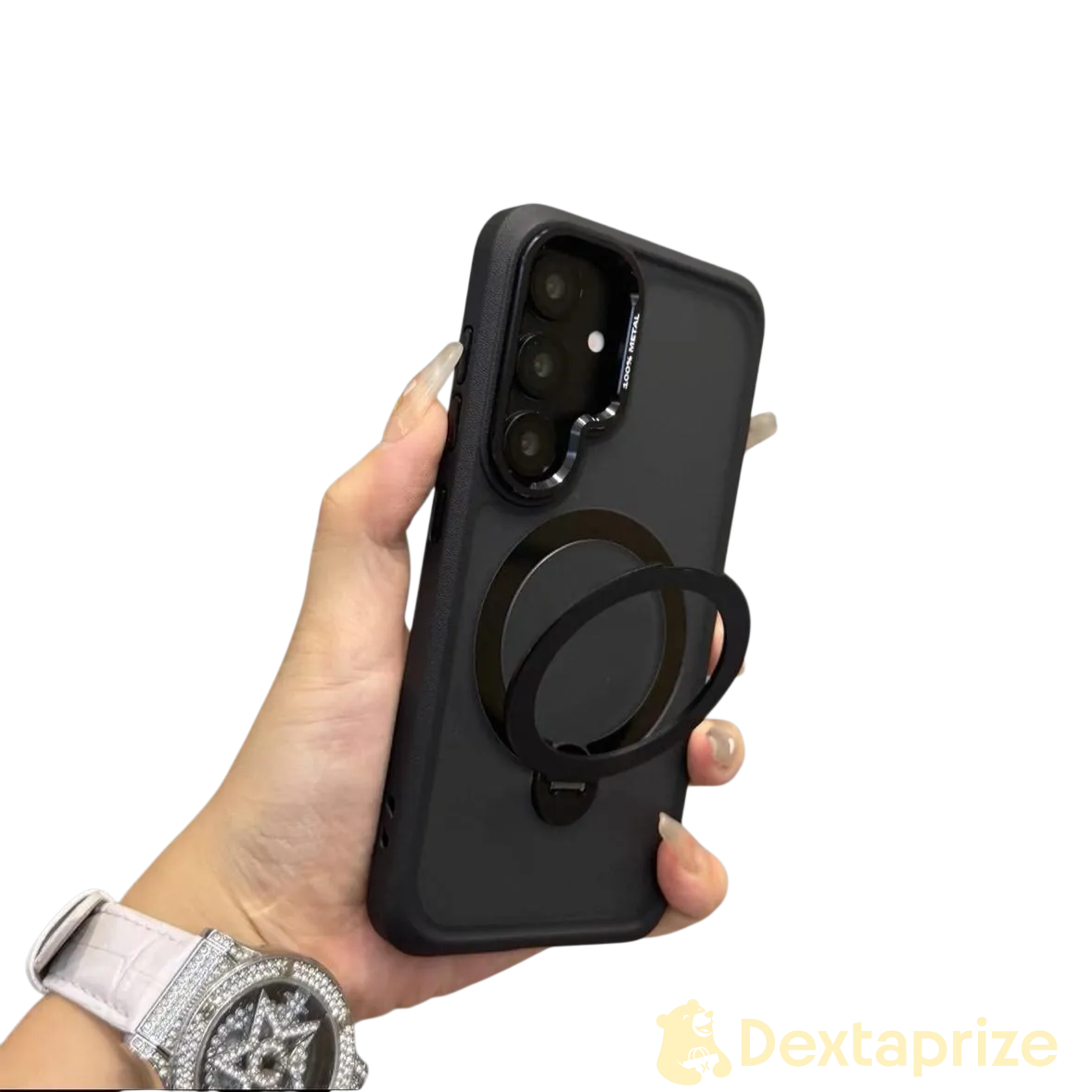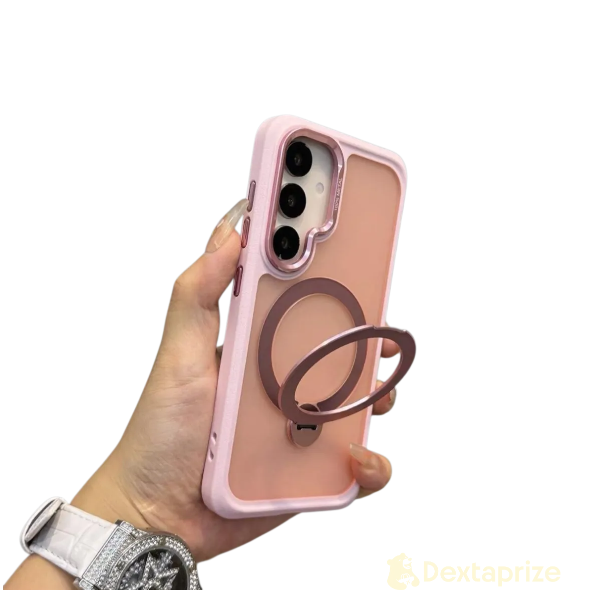 Protect your Samsung Galaxy with this magnetic ring holder phone case featuring a shockproof design, rotating kickstand, transparent back, and secure wrist strap for everyday convenience.