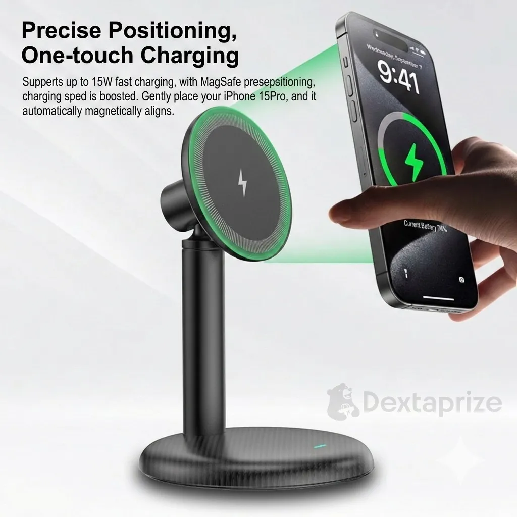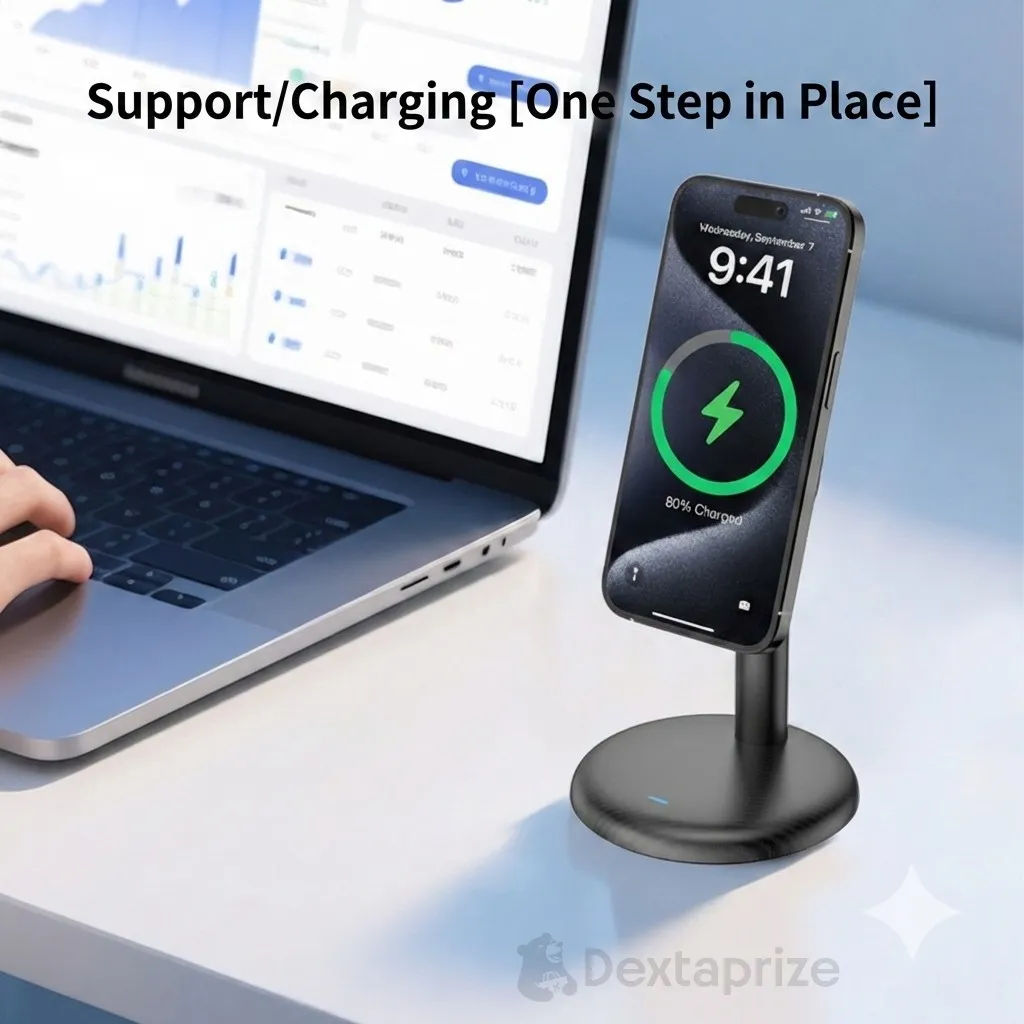 Elevate your desk setup with the OmniCharge Pro Magnetic Wireless Charging Stand. Designed with a philosophy of "simplifying complexity," this premium charger combines architectural elegance with high-performance technology. The precision-engineered magnetic pad ensures instant, perfect alignment with your device every time. Unlike standard chargers, the OmniCharge Pro features a thoughtfully designed rear thermal venting system to dissipate heat, ensuring your phone charges safely and efficiently at maximum speeds. Complete with an ultra-smooth adjustable swivel joint for the perfect viewing angle and a sleek USB-C powered base, it is the ultimate desktop companion for your modern workspace.