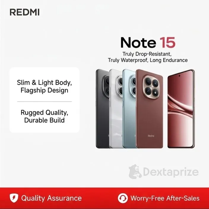 The Redmi Note 15 is a slim flagship smartphone featuring a durable drop-resistant design, waterproof protection, AI multi-camera system, and long-lasting battery. With powerful performance, a stunning display, and modern 5G connectivity, the Redmi Note 1
