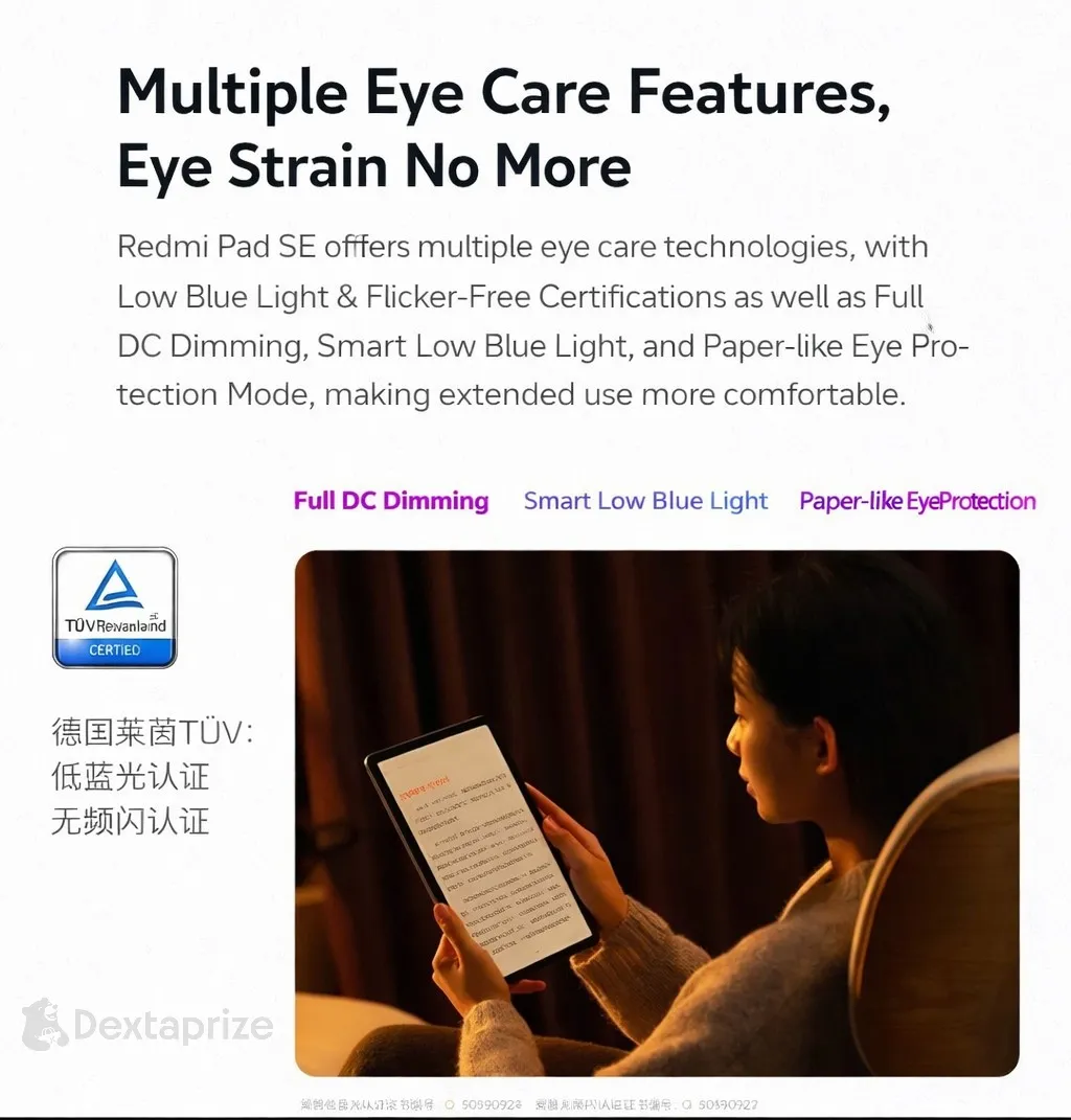 With its massive 8000mAh battery, the Redmi Pad SE offers long-lasting usage, perfect for all-day work or entertainment. It also includes quad speakers with Dolby Atmos, providing immersive audio quality. Combined with TÜV Rheinland eye care certifications, this tablet is ideal for prolonged use without eye strain.