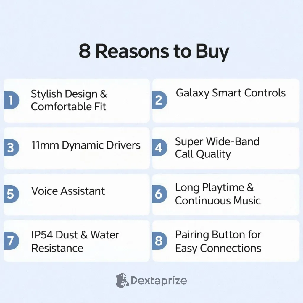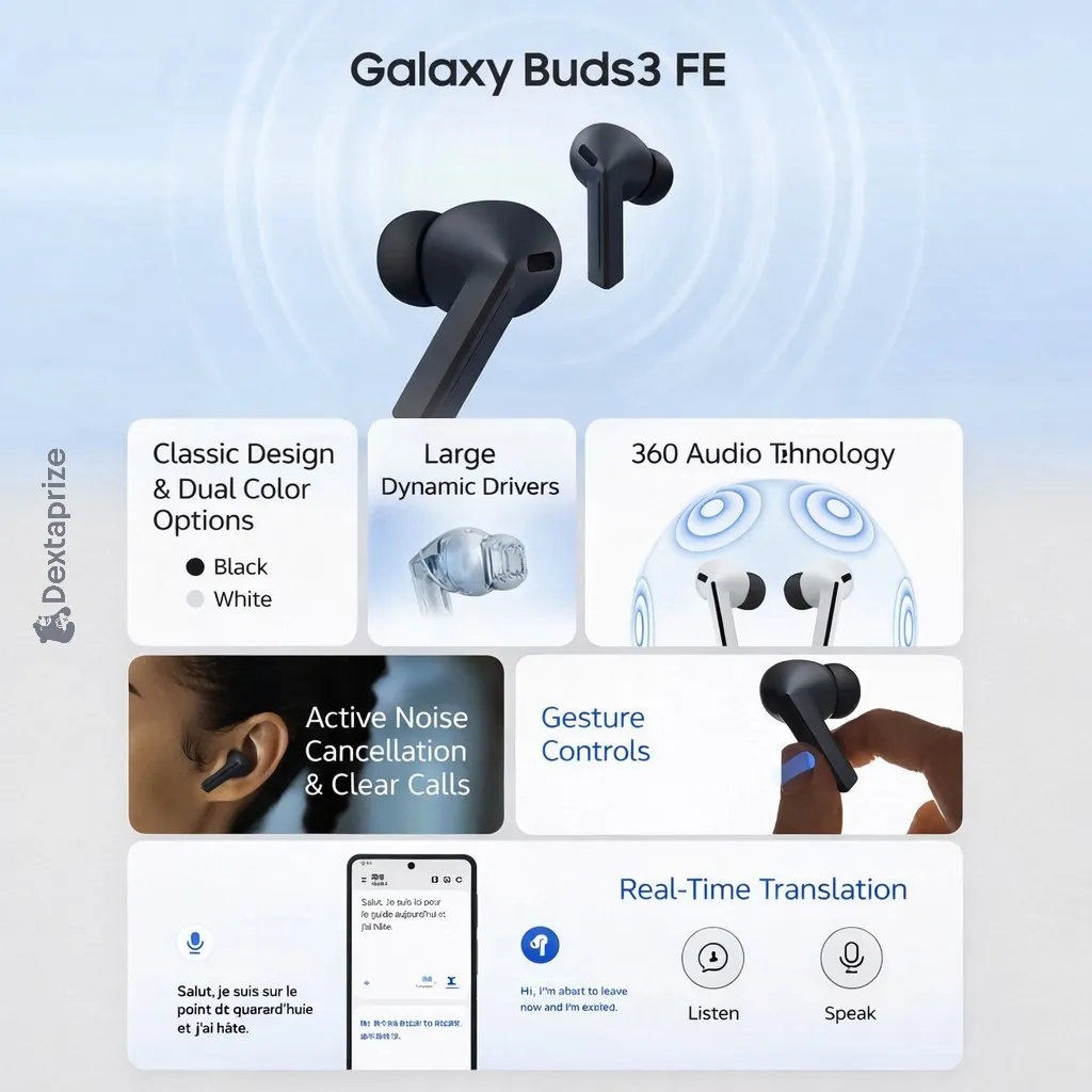 The Samsung Galaxy Buds3 FE deliver immersive sound, intelligent features, and all-day comfort in a sleek, compact design. Built for everyday listening, these wireless earbuds combine powerful 11 mm dynamic drivers, advanced active noise cancellation, and seamless Galaxy device integration.