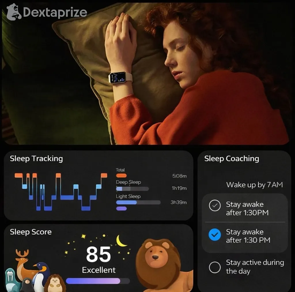 With advanced health tracking, the device monitors heart rate, blood oxygen levels, sleep patterns, stress levels, and daily activities to help you maintain a balanced lifestyle. It supports 100+ workout modes with automatic detection for popular exercises, ensuring accurate fitness tracking whether you're running, cycling, or swimming.