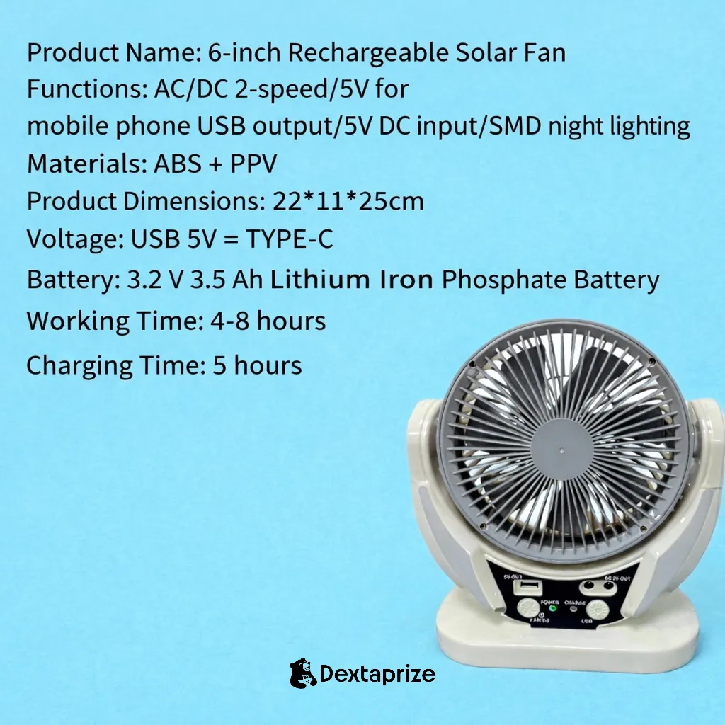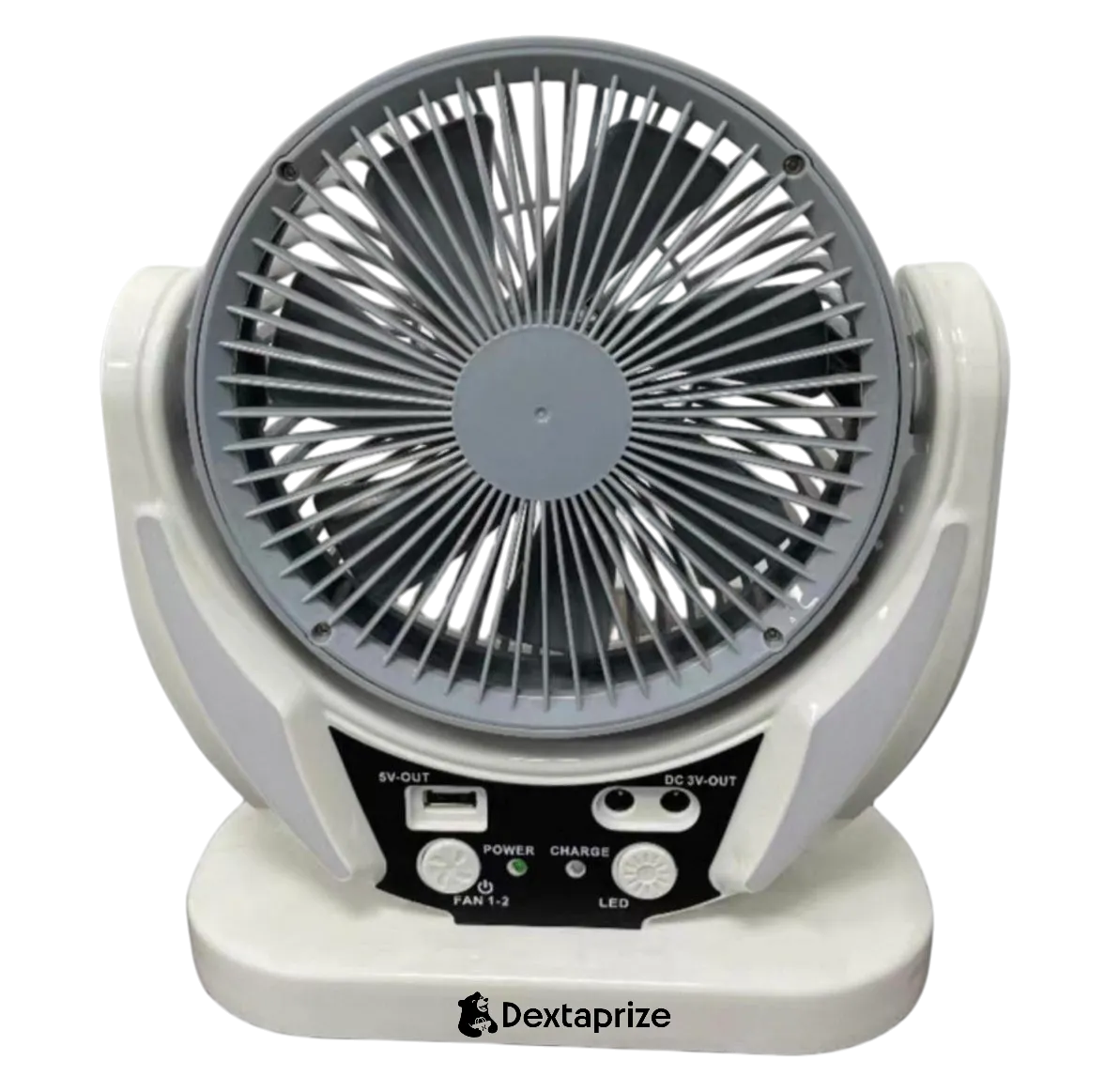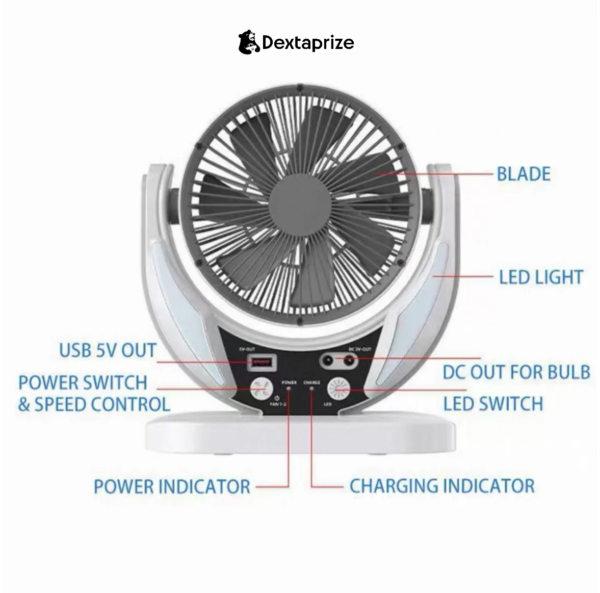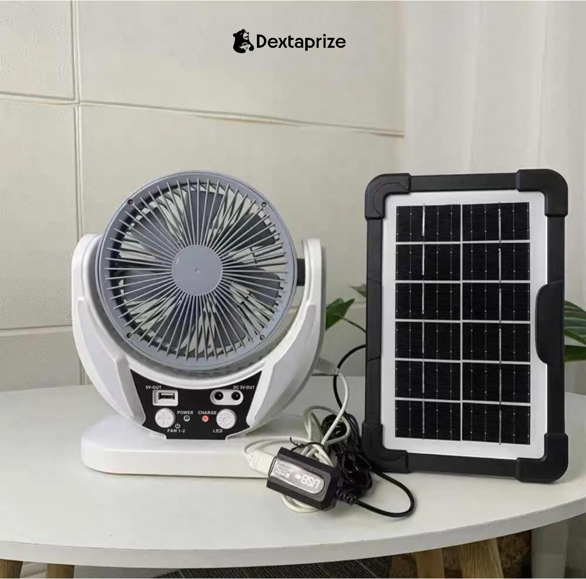 The SolarBreeze Pro Portable Fan Kit is a compact, energy-efficient cooling solution designed for both indoor and outdoor use. Powered by solar energy and rechargeable battery support, this multi-functional device combines a powerful fan, LED lighting system, and versatile charging options.