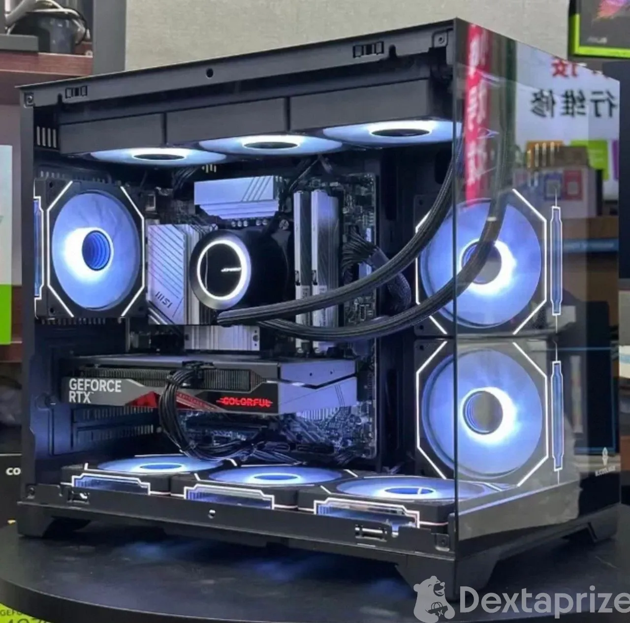 Dominate the competition with the Tiangongfang Elite Custom Gaming PC. Encased in a stunning panoramic glass chassis, this high-end rig features a powerful Colorful GeForce RTX graphics card, a premium MSI motherboard, and an advanced 360mm liquid cooling
