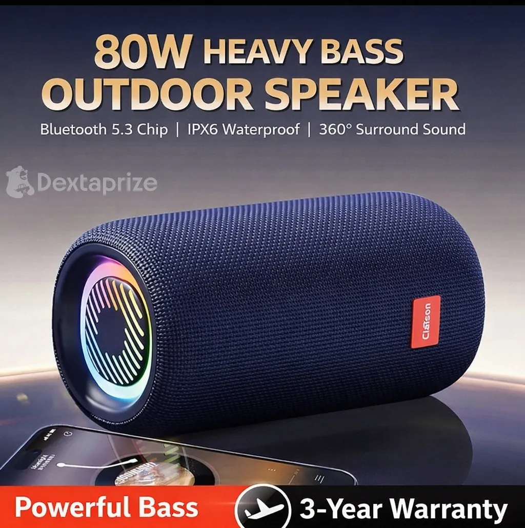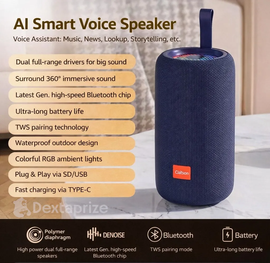 Enjoy powerful audio with the Clafson AI Smart Voice Bluetooth Speaker featuring 360° surround sound, RGB ambient lights, TWS stereo pairing, waterproof design, SD/USB playback, and Type-C fast charging for portable music anywhere.