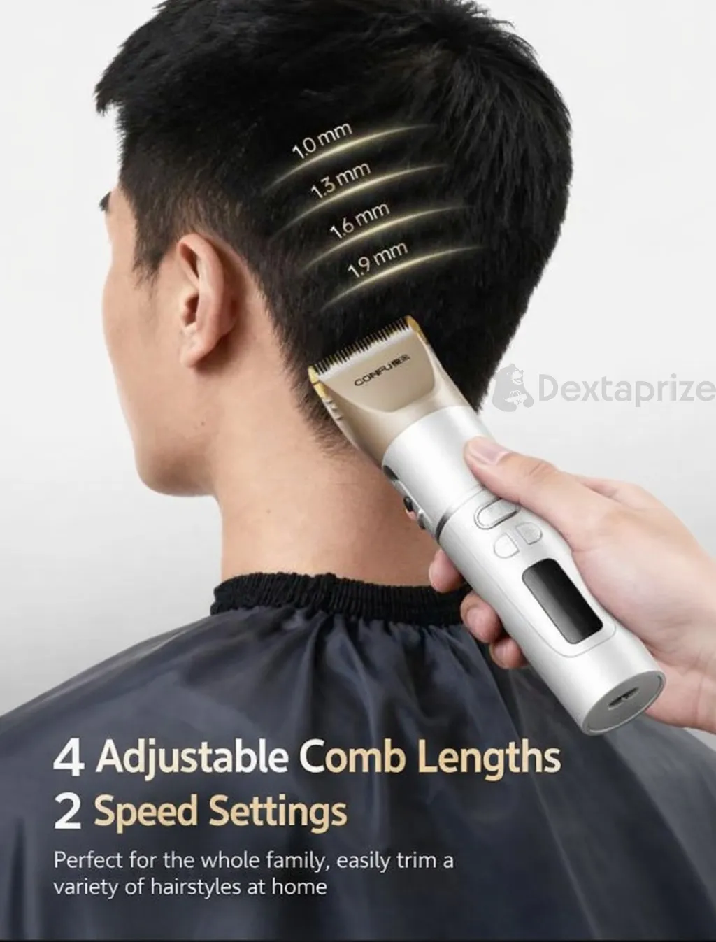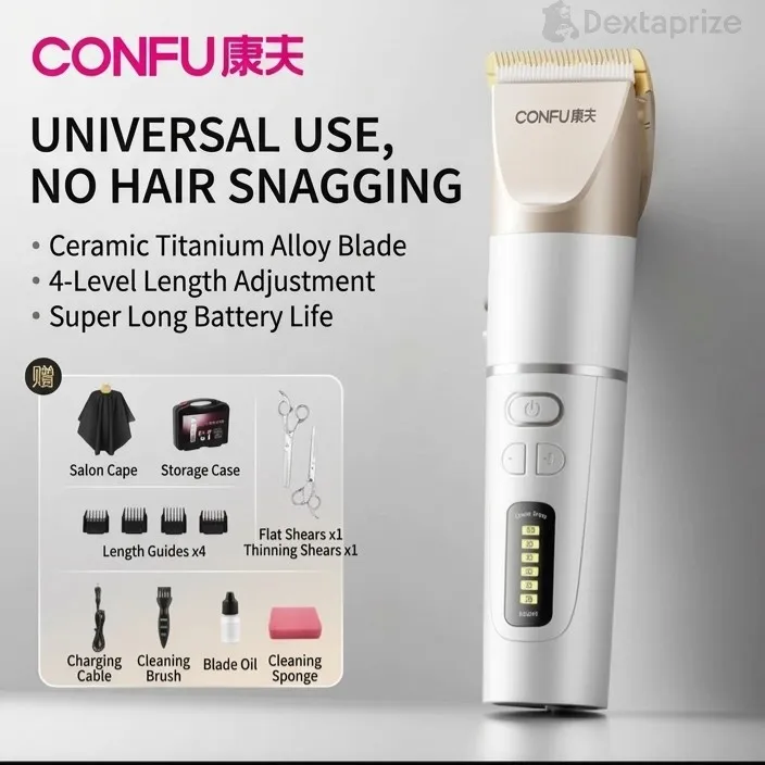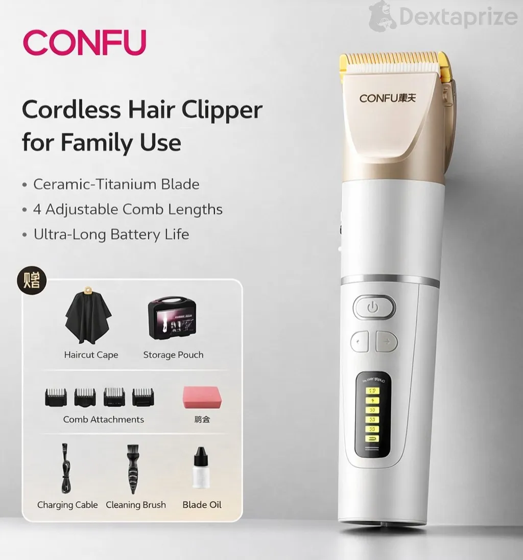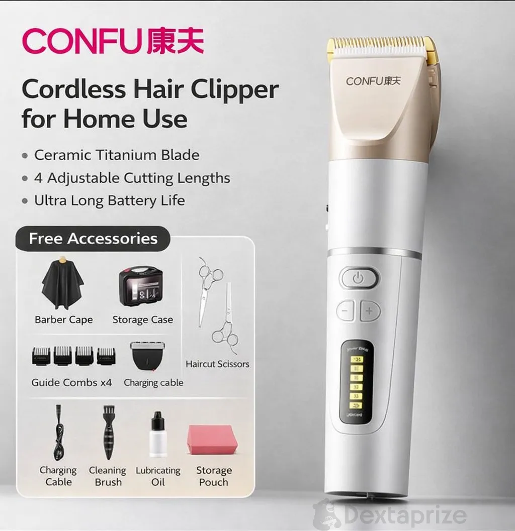 Shop the CONFU cordless hair clipper with ceramic titanium blade, adjustable length combs, and long battery life. Perfect all-in-one professional grooming kit for home and family use.