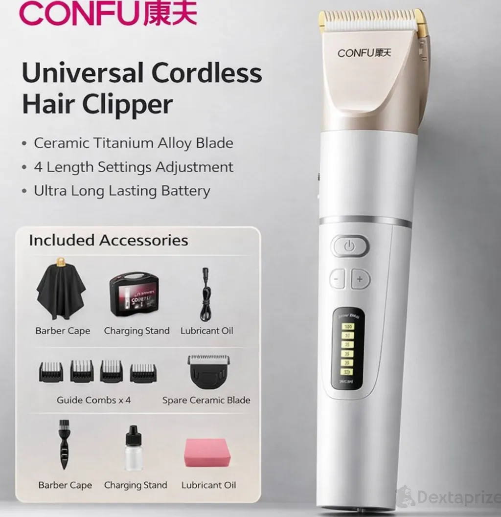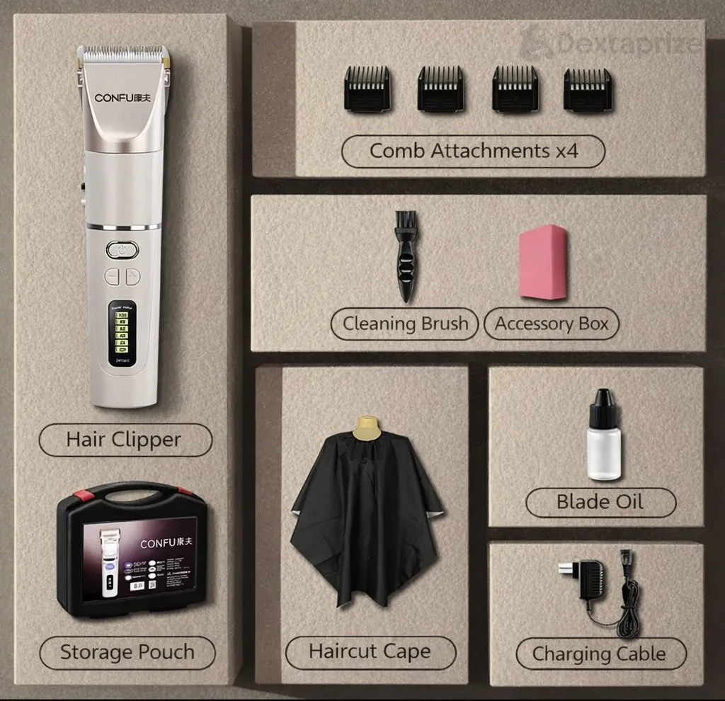 Upgrade your grooming routine with the CONFU Cordless Hair Clipper, designed for precision, comfort, and versatility. Perfect for the whole family, this all-in-one grooming kit delivers smooth, snag-free cutting with its advanced ceramic-titanium alloy blade.