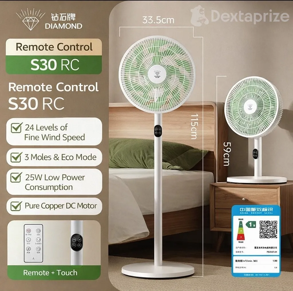 Shop the Diamond S30 DC Inverter Fan (2026 model) with ultra-low power consumption, 24 speed levels, remote and AI voice control. Perfect for inverter and solar use, delivering quiet and efficient cooling for homes and offices.