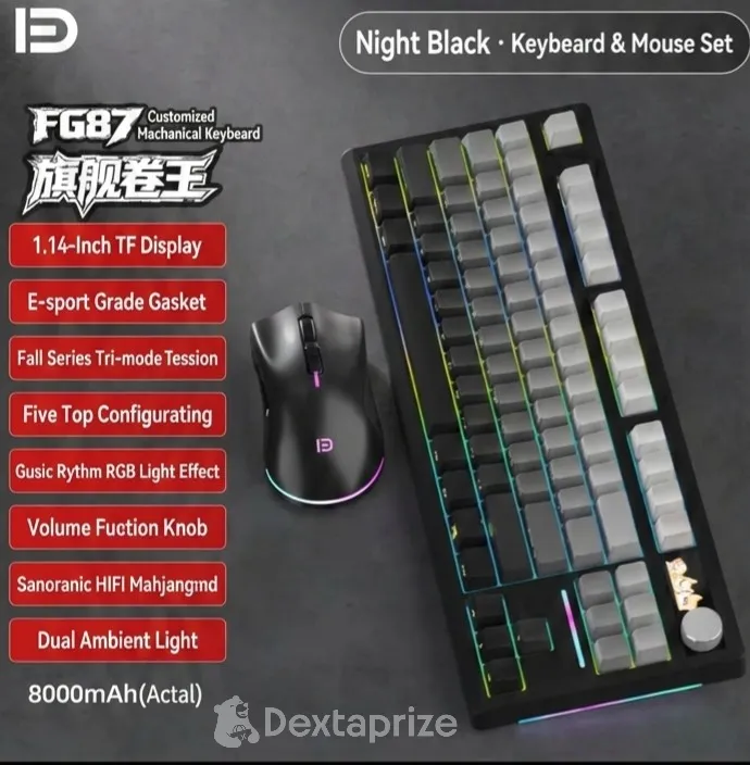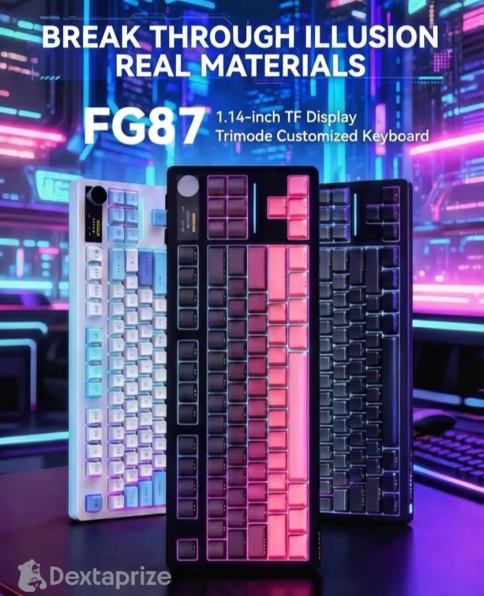 Upgrade your desk setup with the FG87 Custom Mechanical Keyboard. Features tri-mode wireless connectivity, vibrant RGB, and a 1.14" smart display. Shop now!