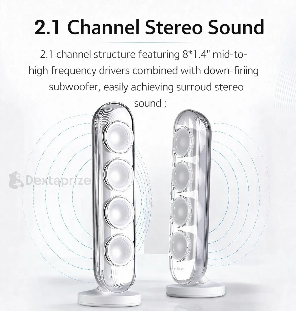 | Design | Transparent dome subwoofer + sleek satellite speakers |