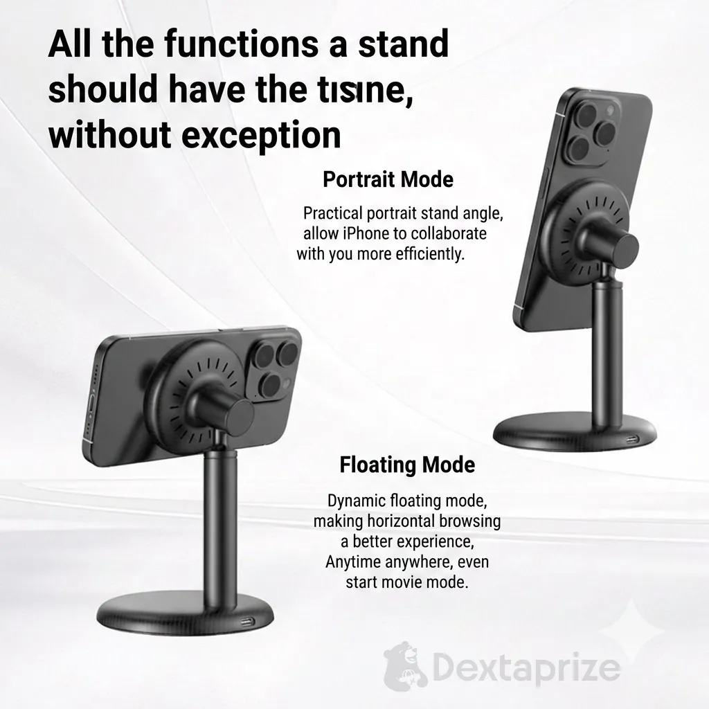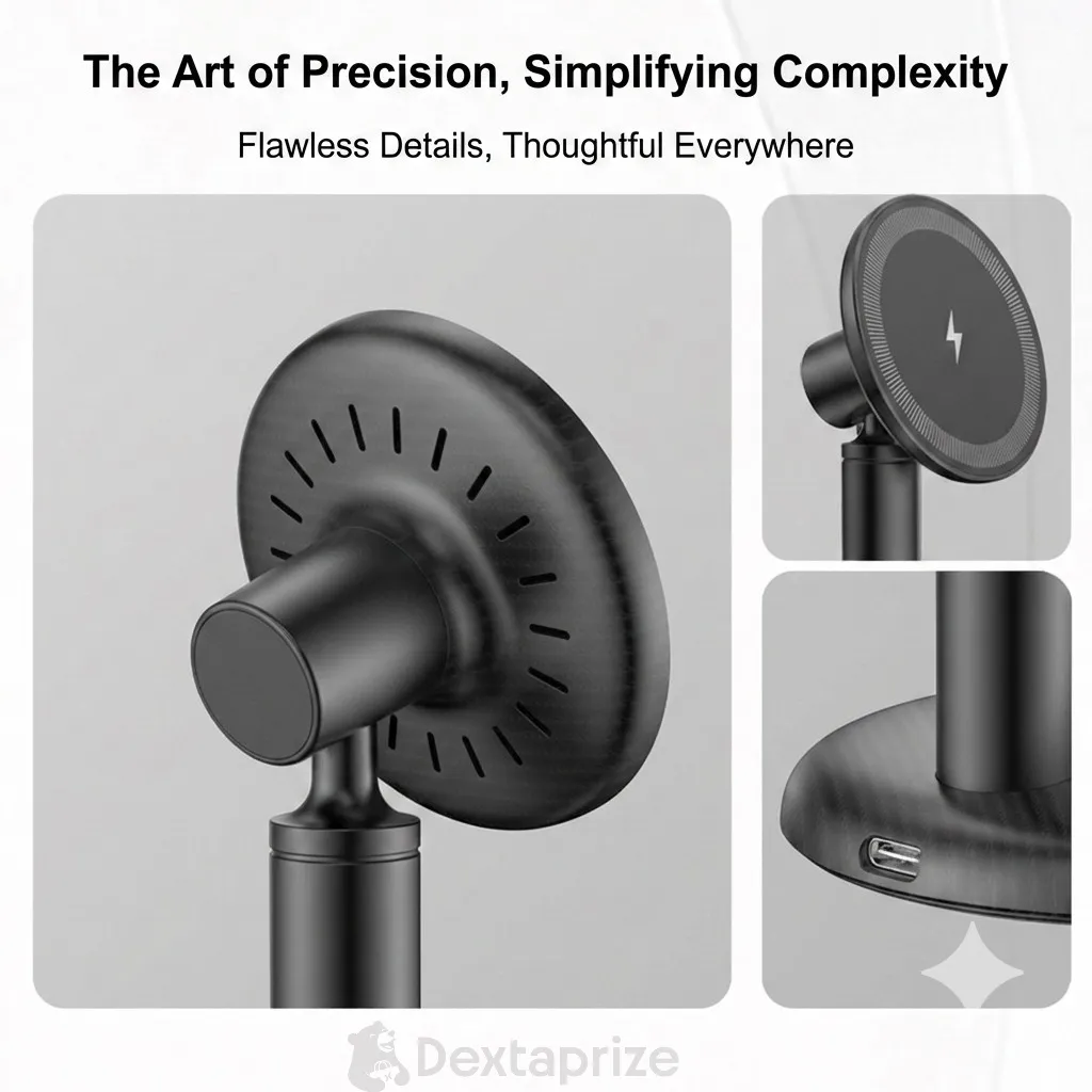 Elevate your desk setup with the OmniCharge Pro Magnetic Wireless Charging Stand. Designed with a philosophy of "simplifying complexity," this premium charger combines architectural elegance with high-performance technology. The precision-engineered magnetic pad ensures instant, perfect alignment with your device every time. Unlike standard chargers, the OmniCharge Pro features a thoughtfully designed rear thermal venting system to dissipate heat, ensuring your phone charges safely and efficiently at maximum speeds. Complete with an ultra-smooth adjustable swivel joint for the perfect viewing angle and a sleek USB-C powered base, it is the ultimate desktop companion for your modern workspace.