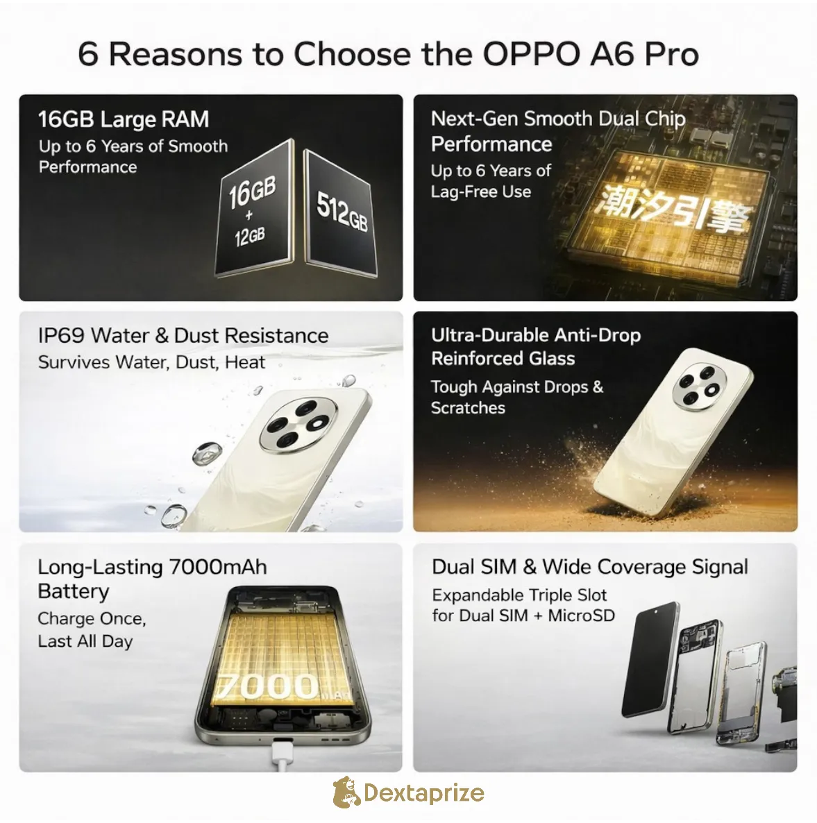 Buy the OPPO A6 Pro 5G smartphone with 16GB RAM, up to 512GB storage, massive 7000mAh battery, IP69 waterproof protection, and powerful performance for everyday use.