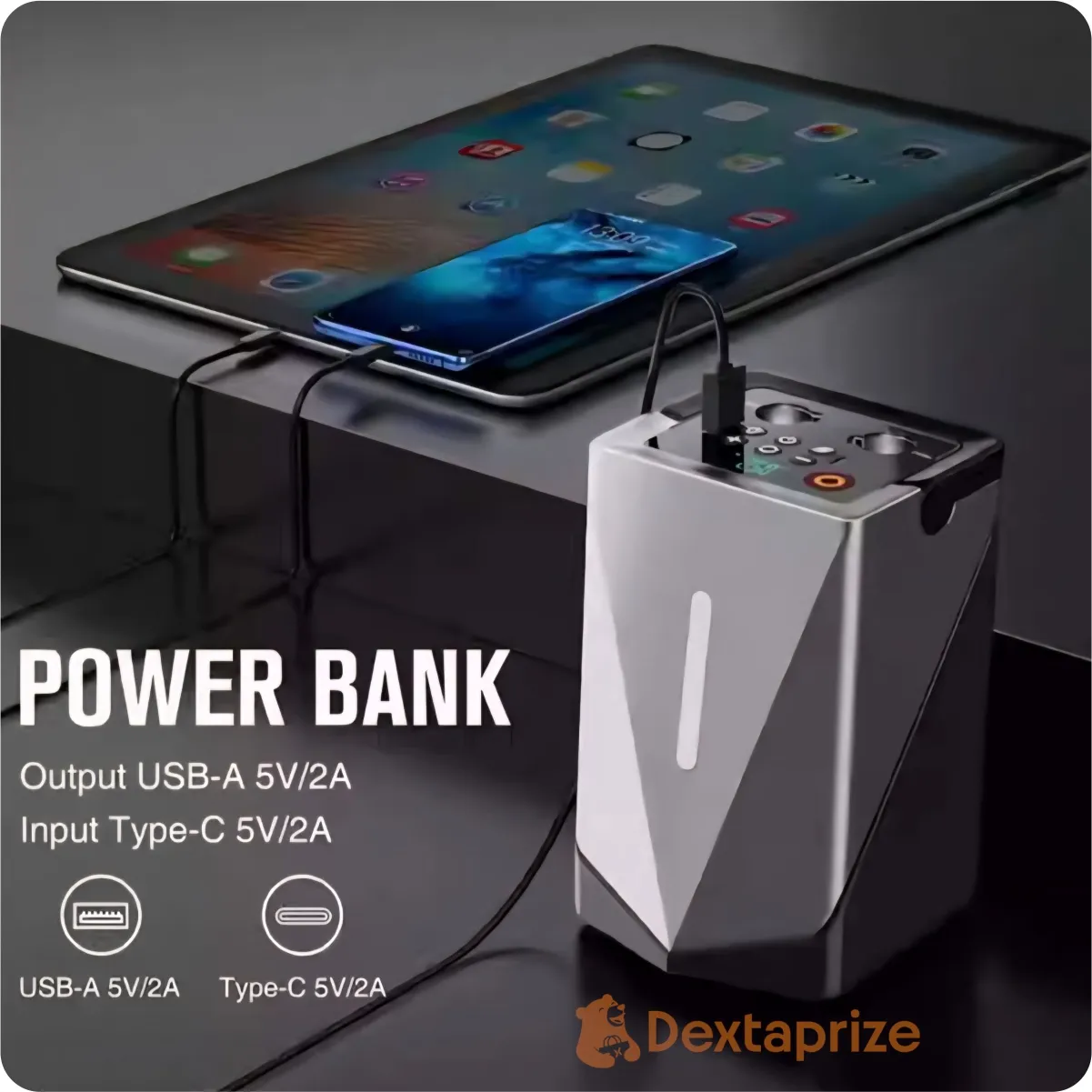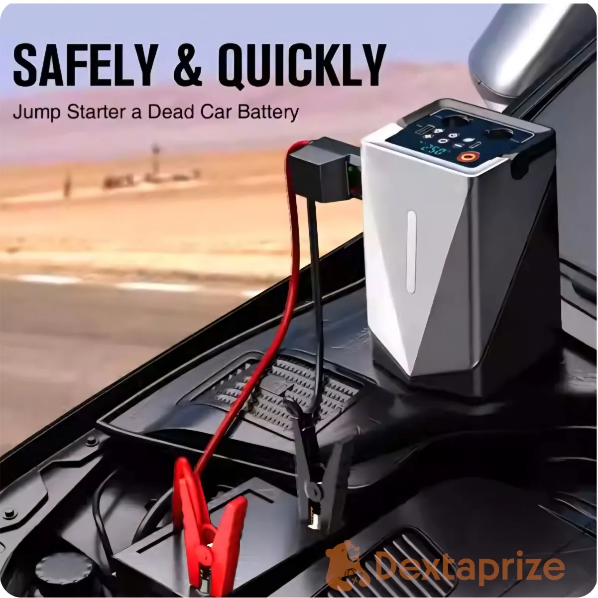 This Portable Car Jump Starter + Tire Air Pump Powerbank is a 2-in-1 emergency tool designed for every driver. It helps you jump start a dead 12V car battery