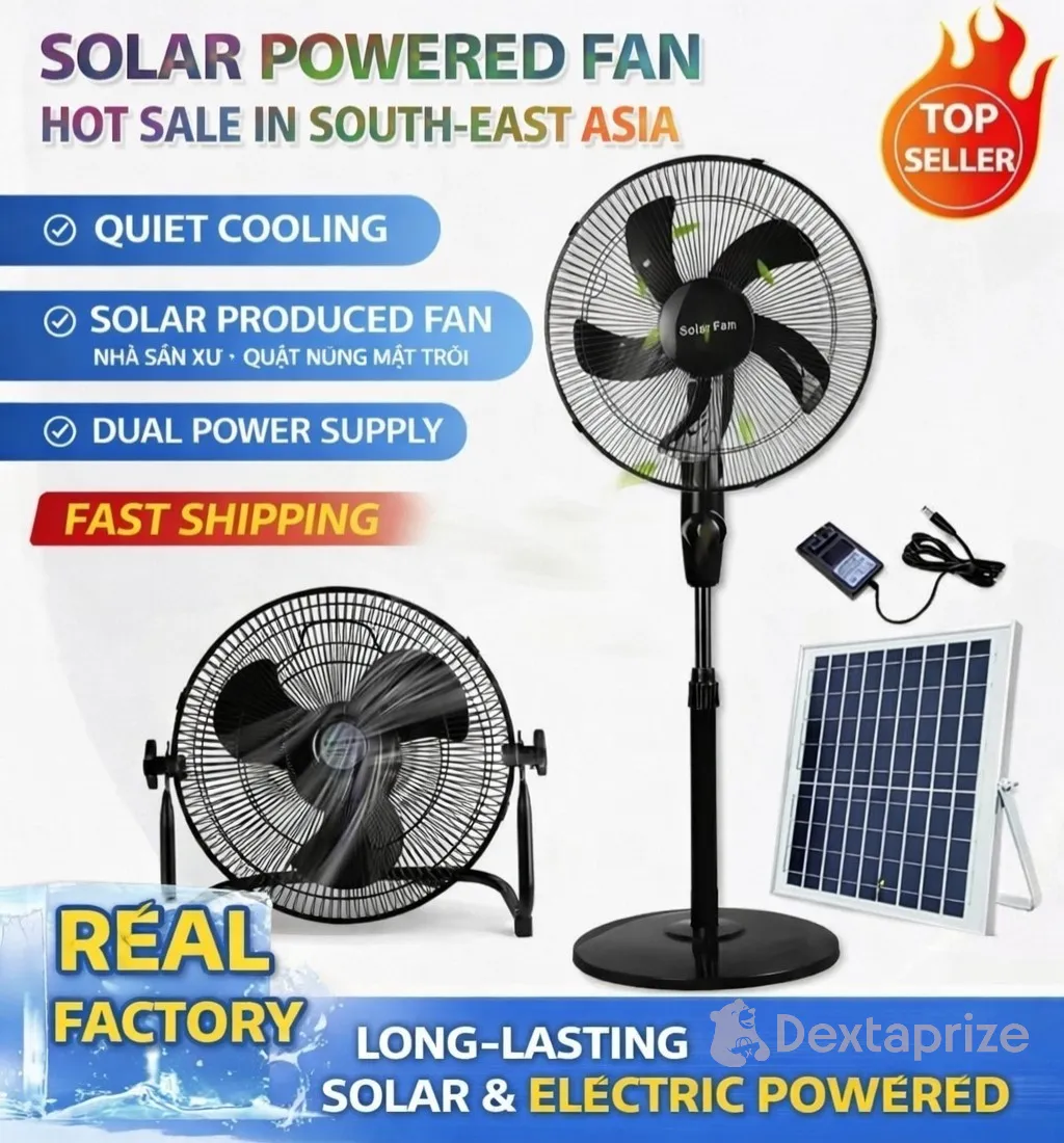 Buy the best portable solar powered fan with dual charging (solar + electric), long battery life, and quiet cooling performance. Perfect for home, outdoor use, and power outages. Energy-efficient and reliable cooling solution.