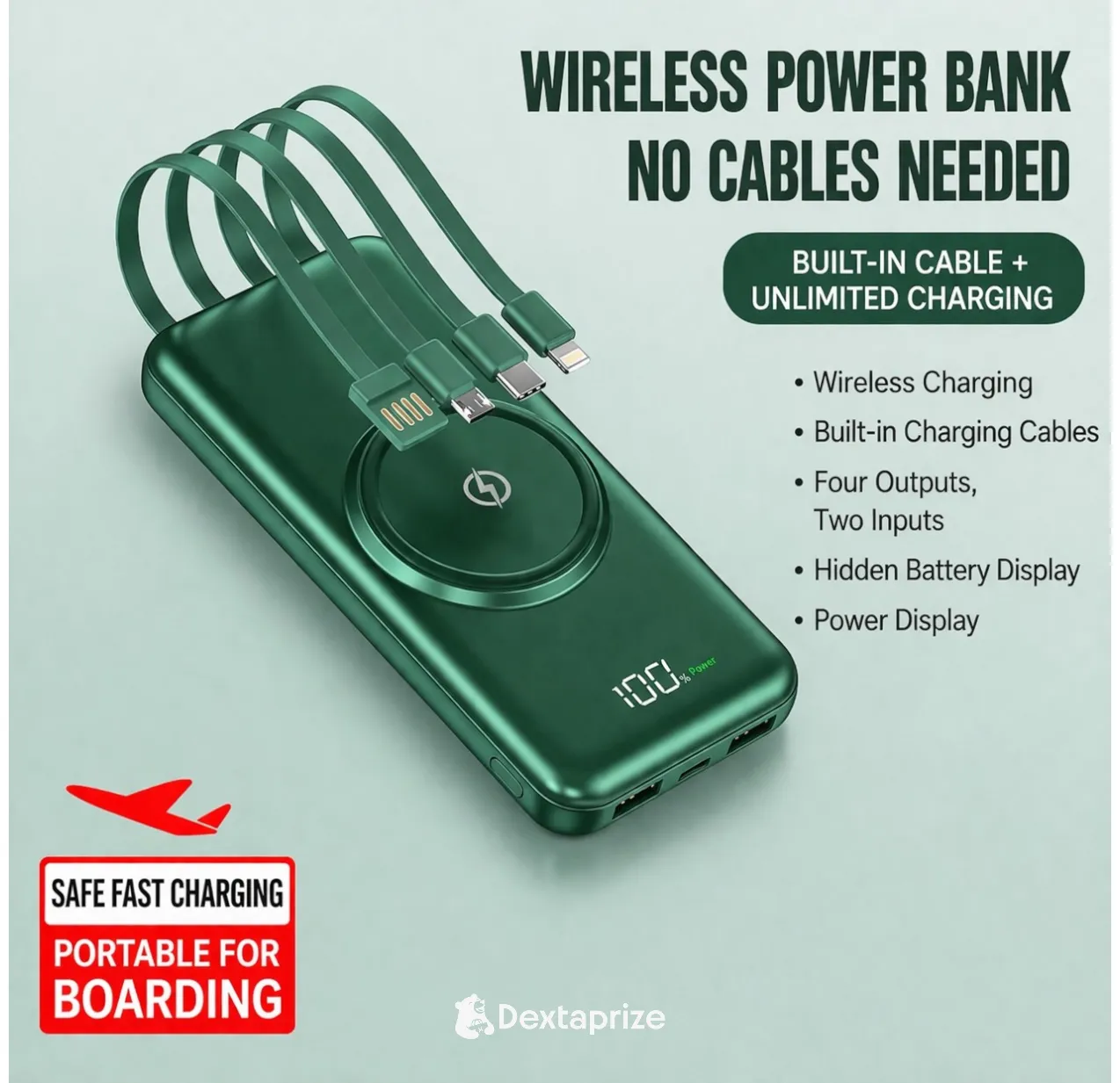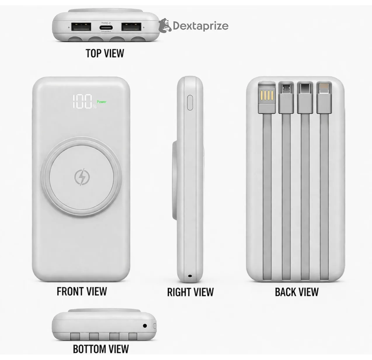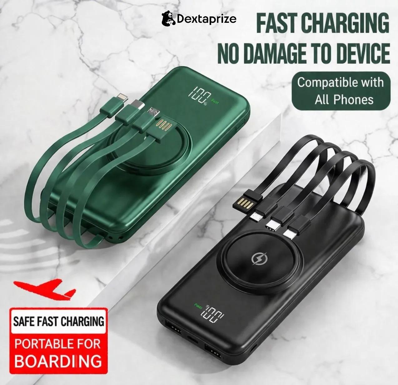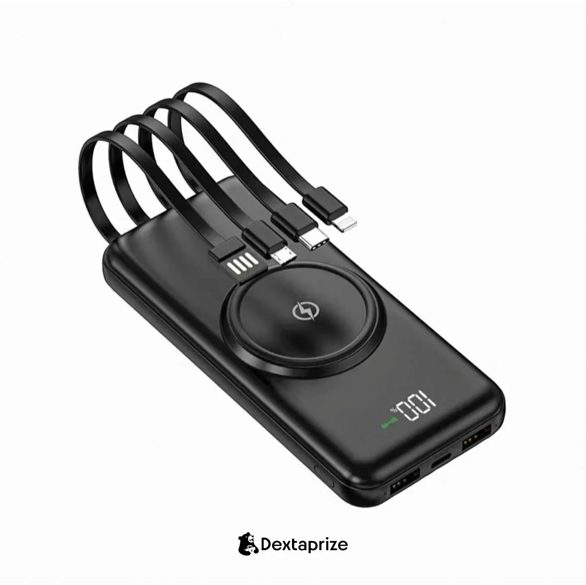 Shop the 4-in-1 wireless power bank with built-in cables for fast, safe charging. Slim, high-capacity portable charger compatible with iPhone, Android, and more.