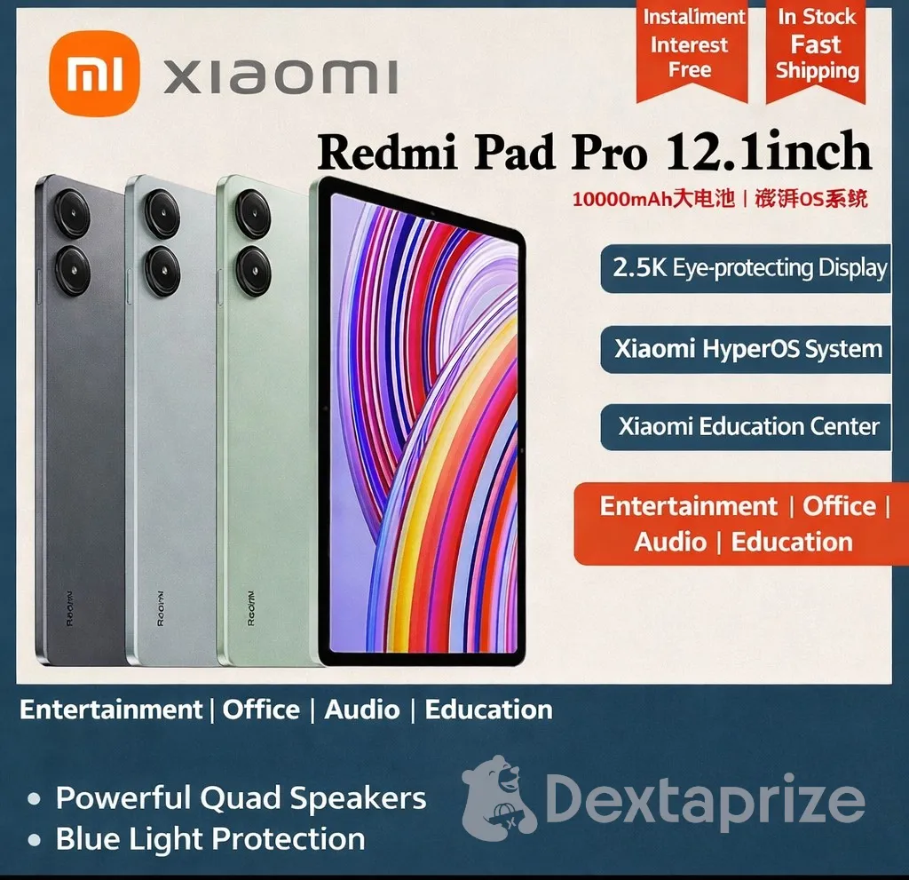 Experience immersive performance with the Redmi Pad Pro 12.1-inch (2024) featuring a 2.5K 120Hz display, Snapdragon 7s Gen 2 processor, 10,000mAh battery, and Dolby Atmos quad speakers—perfect for work, gaming, and entertainment