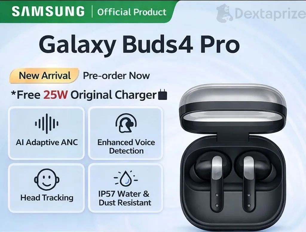 Experience premium sound with Samsung Galaxy Buds4 Pro wireless earbuds featuring Hi-Fi 24-bit audio, Adaptive ANC 2.0, Galaxy AI features, IP57 water resistance, and up to 30 hours battery life.