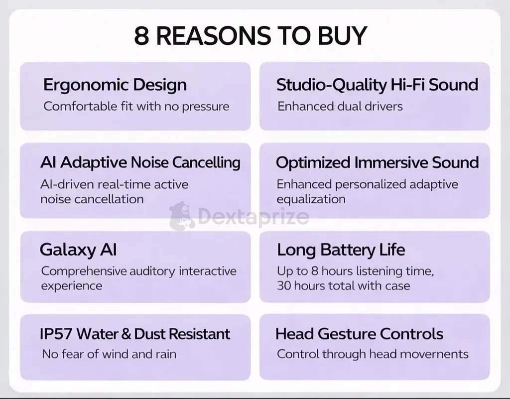 | Smart Features | Galaxy AI integration, Real-time translation in supported languages, Voice assistant support, Head gesture controls for calls Seamless pairing with Galaxy devices |