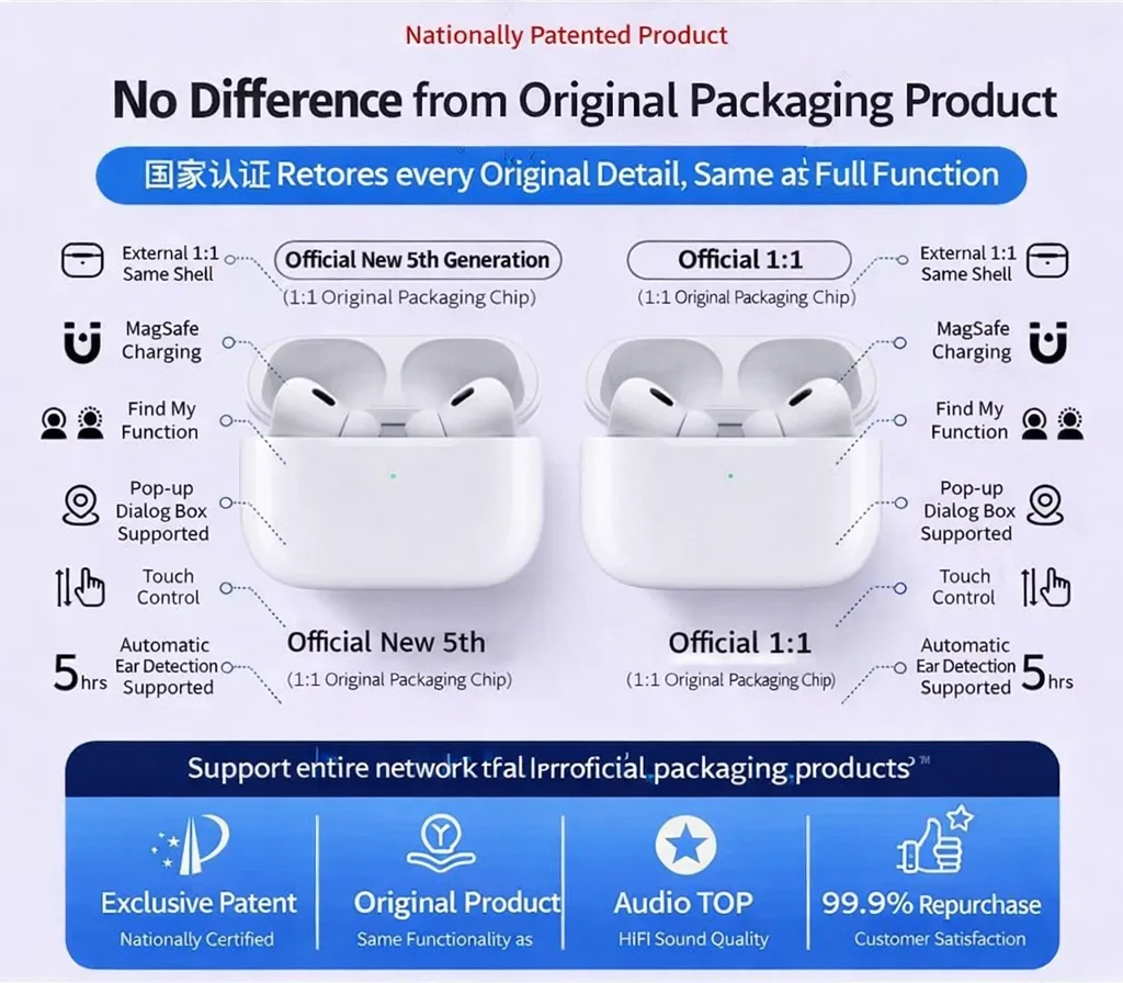 Experience top-tier audio without compromise. The SonicPro True Wireless Earbuds are engineered with an exact 1:1 external shell and original-spec chip, restoring every detail of the premium earbud experience you expect. Enjoy seamless integration with your smart devices thanks to instant pop-up dialog box pairing, and never lose track of your audio gear with the built-in "Find My" tracking function. Delivering top-tier HiFi sound quality, these earbuds feature smart touch controls, automatic in-ear detection, and up to 5 hours of continuous playback. Fully compatible with MagSafe wireless charging, they offer uncompromising, original-level functionality.