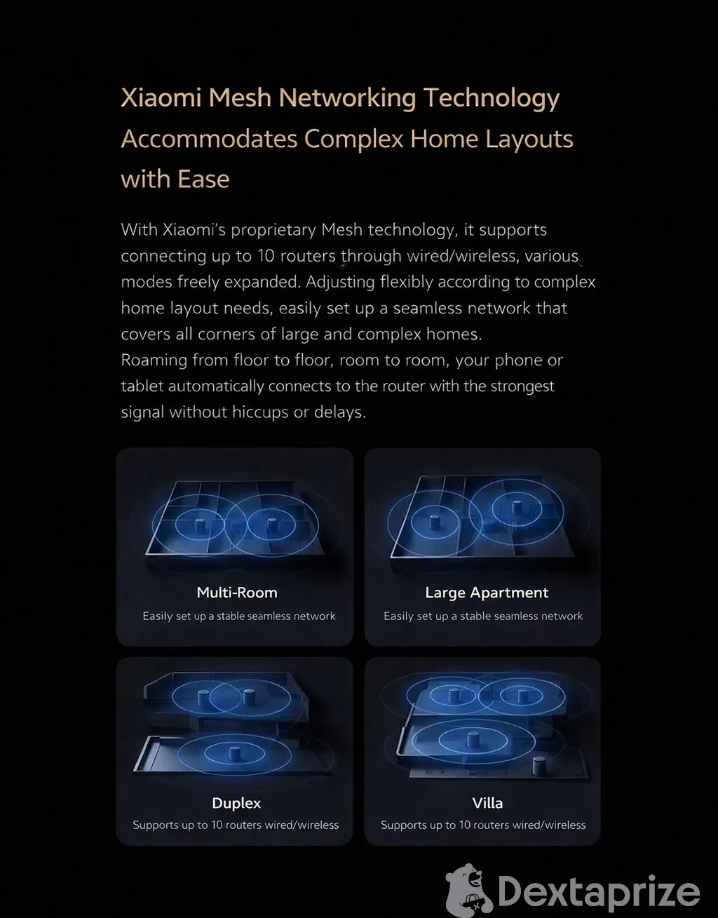 | Coverage & Features | Whole-home mesh Wi-Fi coverage, 4 signal amplifiers for strong wall penetration, Seamless roaming between nodes, Supports up to 10 mesh units |